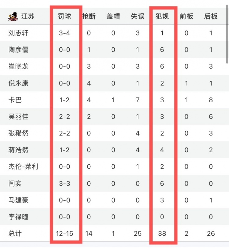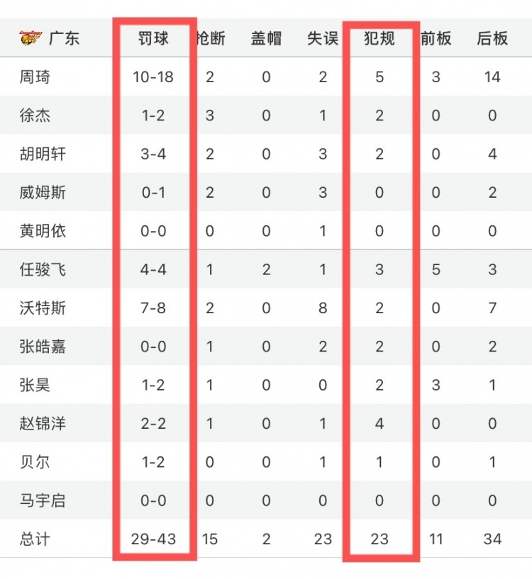 本场比赛,双方犯规不断,两队共出现61次犯规,其中广东23次,江苏38次,共出现58次罚球,其中广东43罚29中,江苏15罚12中,江苏这边陶彦儒、崔晓龙和闫实三人犯满。