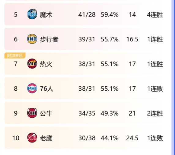本场比赛之前,76人38胜30负排在东部第6位,而步行者(38胜31负)、热火(37胜31负)紧随其后;但今天步行者和热火纷纷赢球,而76人输球,所以步行者(39胜31负)升至第6位,76人和热火都是38胜31负,由于胜负关系,热火排在第7位,76人降至第8位。