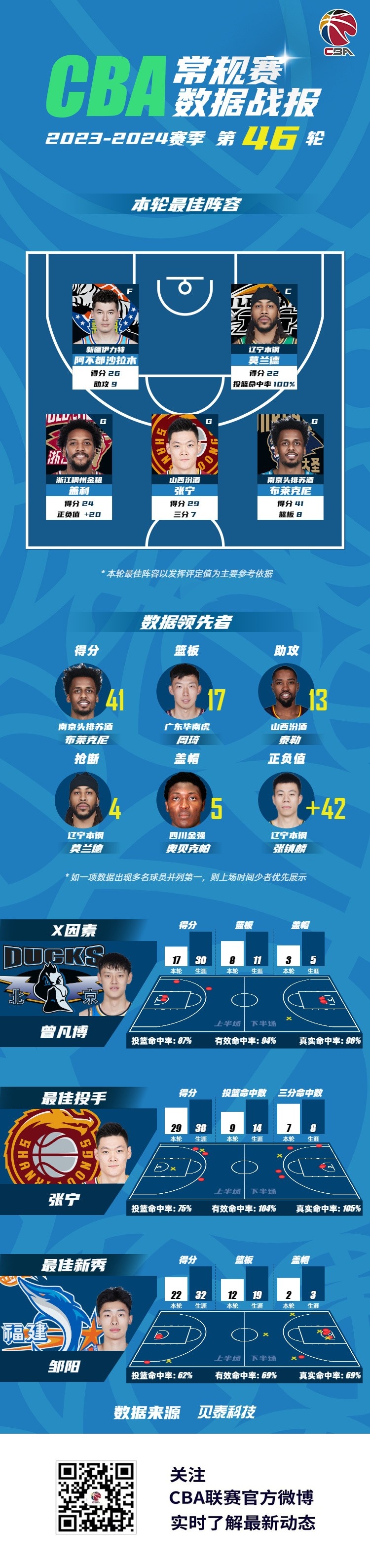 数据领先者方面:南京头排苏酒球员布莱克尼以单场41分的数据领衔得分榜;