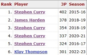 在NBA历史上,仅有七次单赛季三分破300+的个人表现,除库里的五次外,哈登一次,克莱一次。