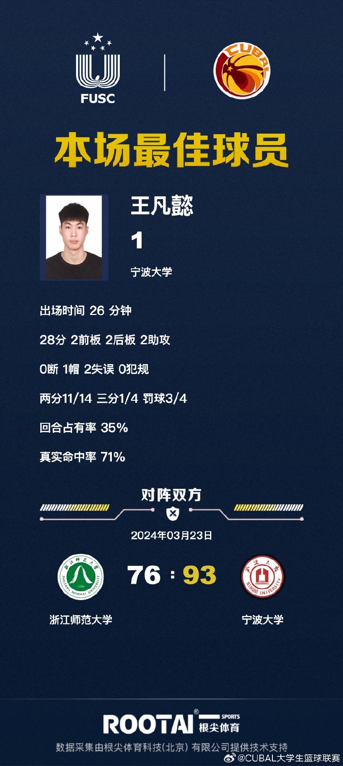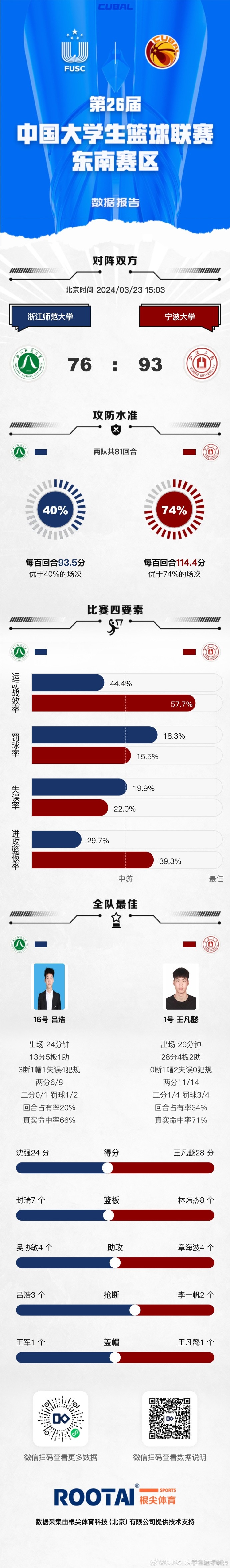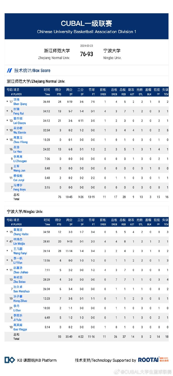 宁波大学:王凡懿28分4篮板2助攻,章海波12分5篮板4助攻2抢断,林炜杰20分8篮板2抢断,李一帆4分2助攻,赵嘉浩5分7篮板,朱柏滔4分7篮板,孙文卓6分,季雨乐5分。