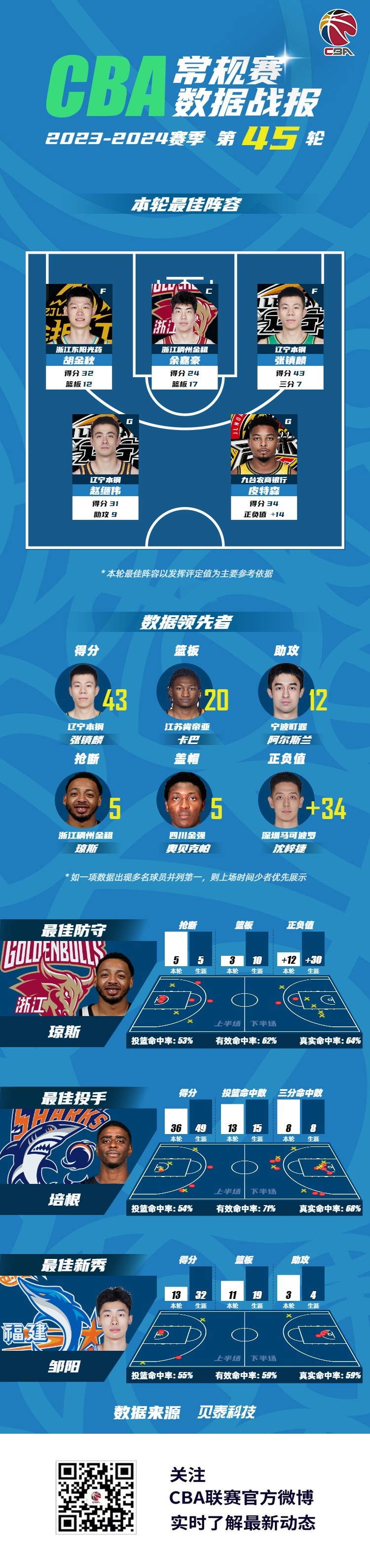 数据领先者方面:辽宁本钢球员张镇麟以单场43分的数据领衔得分榜;