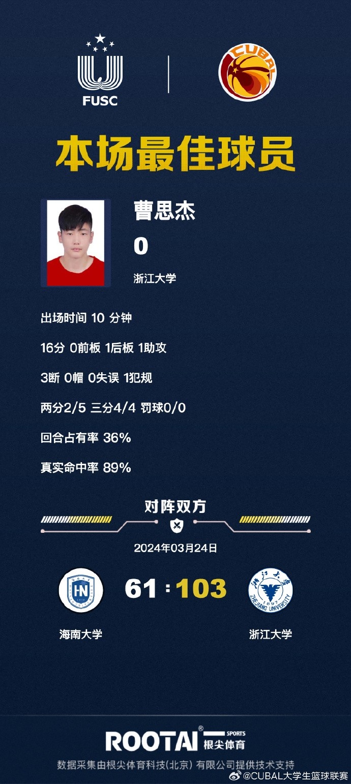 末节开局海南大学依靠林升瑞和王展博的连续拿分抢开局,浙大这边手握大比分领先没有太大压力,随着姚宇航也拿下2分,浙大12人登场全部有得分入账,双方也以练兵形式打完第四节比赛。最终,浙江大学103-61击败海南大学拿下比赛。