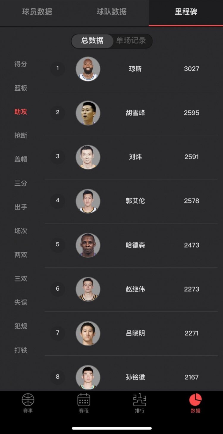 目前比赛进行到第四节,浙江球员吴前拿到9次助攻,这样他的生涯总助攻数达到1985次,位列CBA历史第九位。