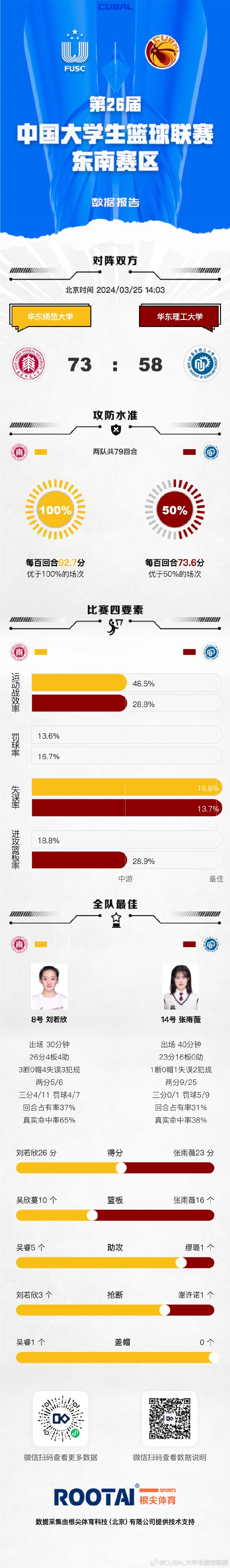 末节决战,刘若欣继续保持进攻端的稳定,双方都很拼但受到体力影响效率并不高,张雨薇接连中投继续追分,金子萱切入上篮后吴睿三分还能回应,华东师大牢牢掌握住双位数领先,华东理工接连二次进攻打成,刘若欣里突外投连砍5分还能强势回应,最终华东师大73-58力克华东理工。