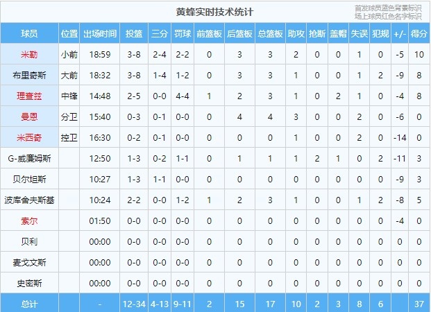 上半场,黄蜂进攻端表现极其低迷,全队34投12中,命中率仅有35.3%,全队半场仅拿到37分,以37-51落后骑士。