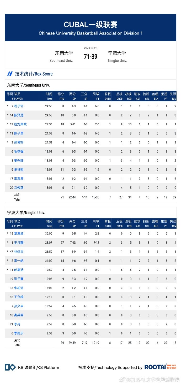 东南大学:赵刘其政18分10篮板、陈泽茏10分2篮板2抢断、祝子轩8分、陈子昂8分3篮板、郑博轩4分2篮板、毛棋锋6分3篮板、单林熙11分2篮板、姜兴陆4分4篮板。