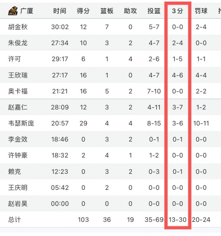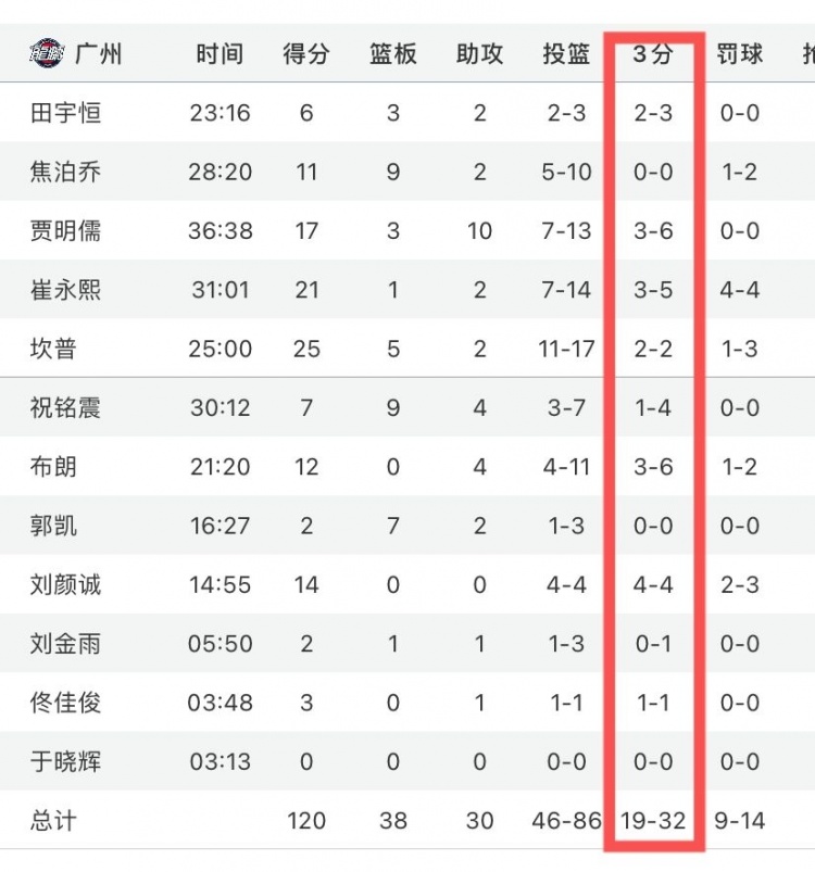本场比赛,两队在外线的表现有些差距,其中广州全队32投19中,而广厦只有30投13中。