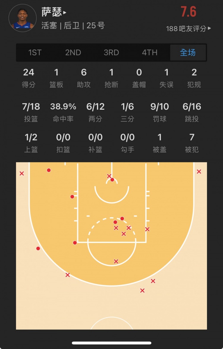 活塞25号秀 马库斯-萨瑟 出战34.6分钟