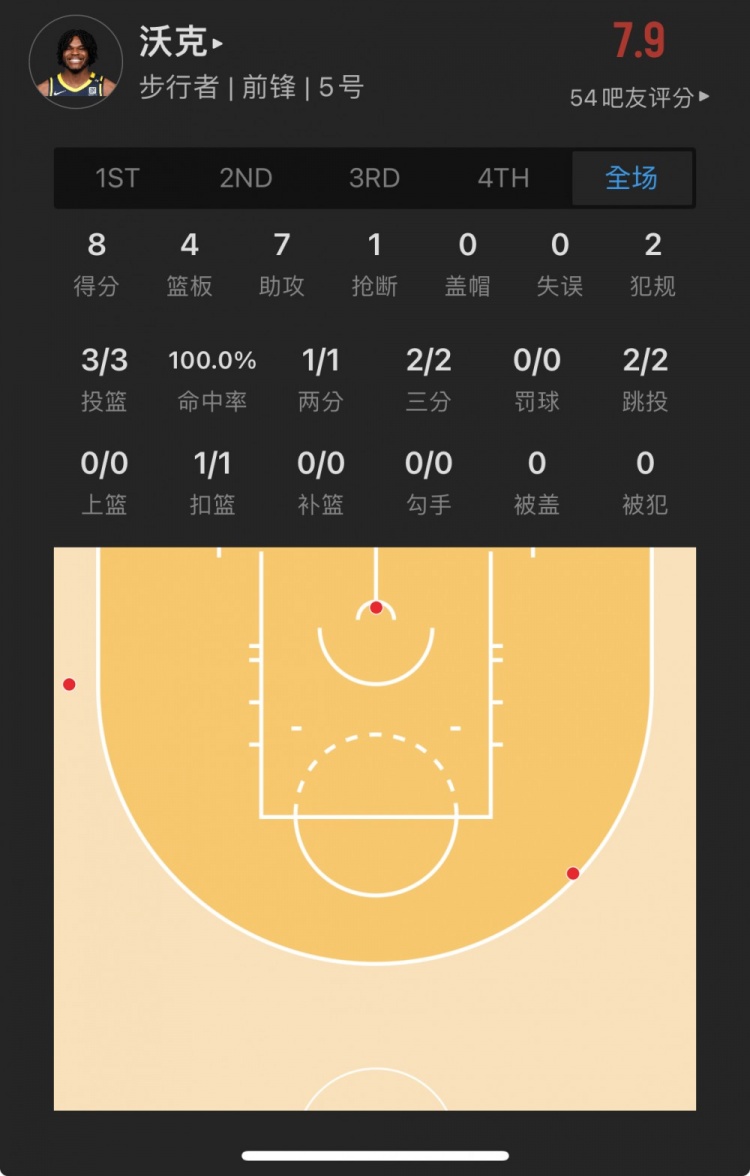 步行者8号秀 贾雷斯-沃克 出战29.4分钟