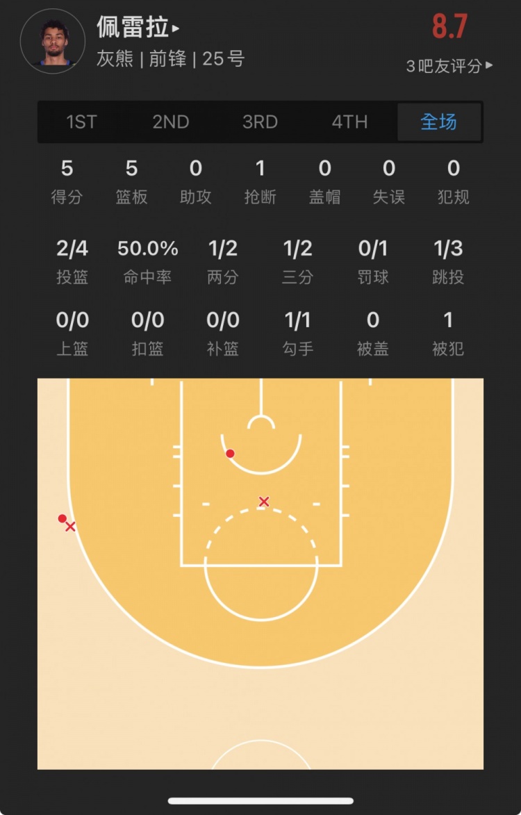 灰熊落选秀 芒齐尼亚-佩雷拉 出战5.9分钟