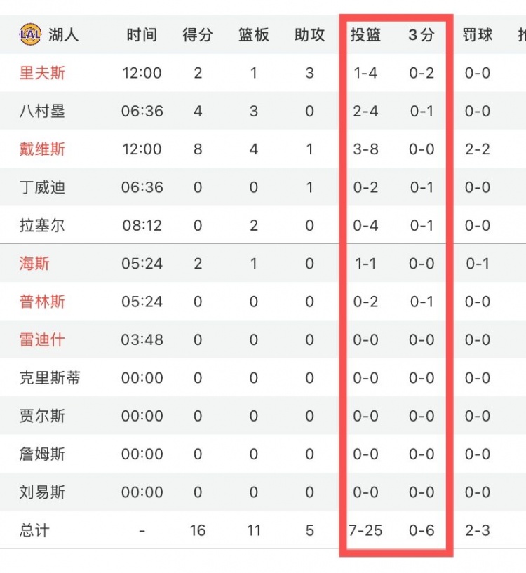 首节比赛,湖人全队手感不佳,合计25投7中,三分球6中0,只拿到16分,首节就落后了16分。