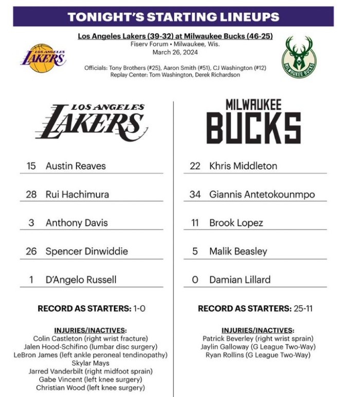 湖人首发:里夫斯、八村塁、浓眉、丁威迪、拉塞尔。