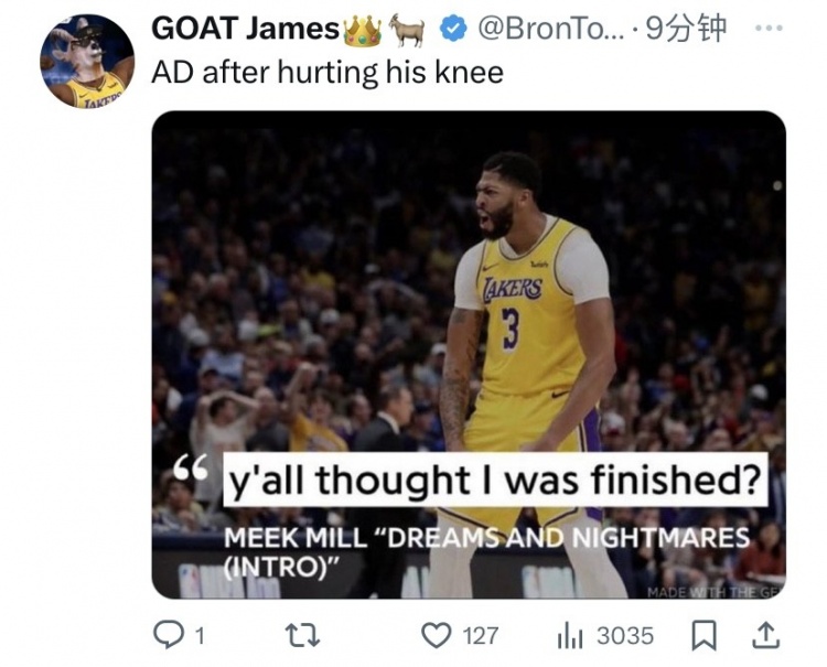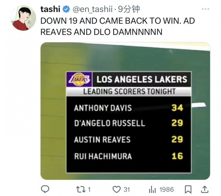 @tashi:我湖落后19分逆转取胜!!浓眉、里夫斯、拉塞尔这仨太牛了我靠!!!