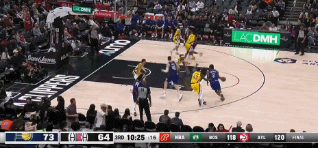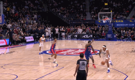 4、普尔右脚往前迈一步,规则上来讲这是第二步,动作上来讲这是上下步;随后,左脚先抬起,右脚后抬起;中轴脚(左脚)落地之前,普尔已经完成出手。