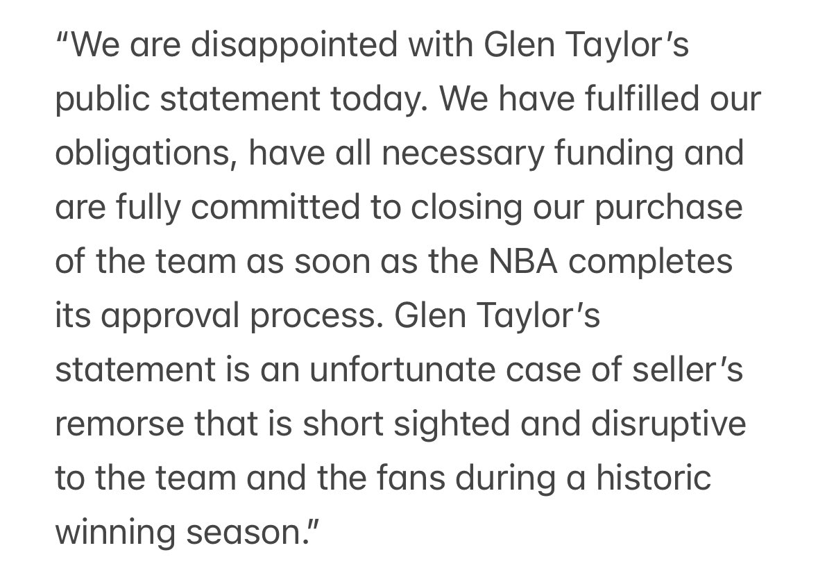 买家发言人声明:“我们对格伦-泰勒(森林狼老板也是卖家)的公开声明表示失望。我们已经履行了应尽的义务,筹集了足够的资金,只待NBA完成许可程序之后就致力于完成收购球队的收尾工作。格伦-泰勒的声明就是卖家目光短浅反悔的反面教材,对于经历了这样一个历史性赛季的球队和球迷来说都是极具破坏性的行为。”
