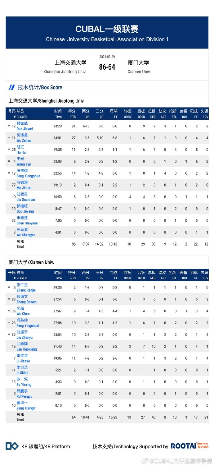 上海交大:吴泽昊27分7篮板3抢断,顿家威21分9篮板3助攻,冯祥硕14分4助攻,胡汇11分7篮板4抢断,刘冠男6分8篮板