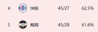 鹈鹕战绩来到45胜28负,仍排在西部第5,距离西部第4的快船仅0.5胜场差。