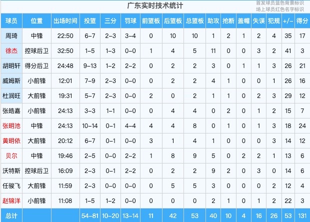 本场比赛,广东全队6人得分上双,分别是:张明池24分、胡明轩21分、周琦17分、威姆斯16分、杜润旺12分、黄明依12分。