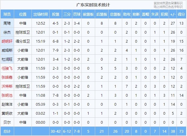 上半场,广东火力全开,全队42投30中,三分12中6轰下73分,半场以73-35领先广厦38分。