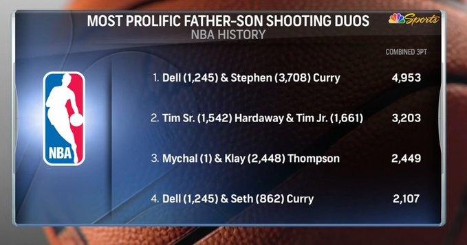 赛前转播方晒出一组数据,NBA历史三分最高产的父子组合排行榜如下: