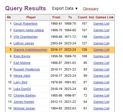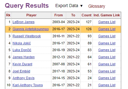 这也是字母哥生涯第127次砍下至少30分10板5助,与詹姆斯并列历史第四。
