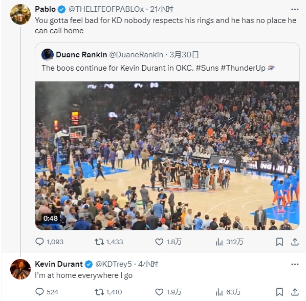 杜兰特则回复:我去哪里哪里就是家(I’m at home everywhere I go)。