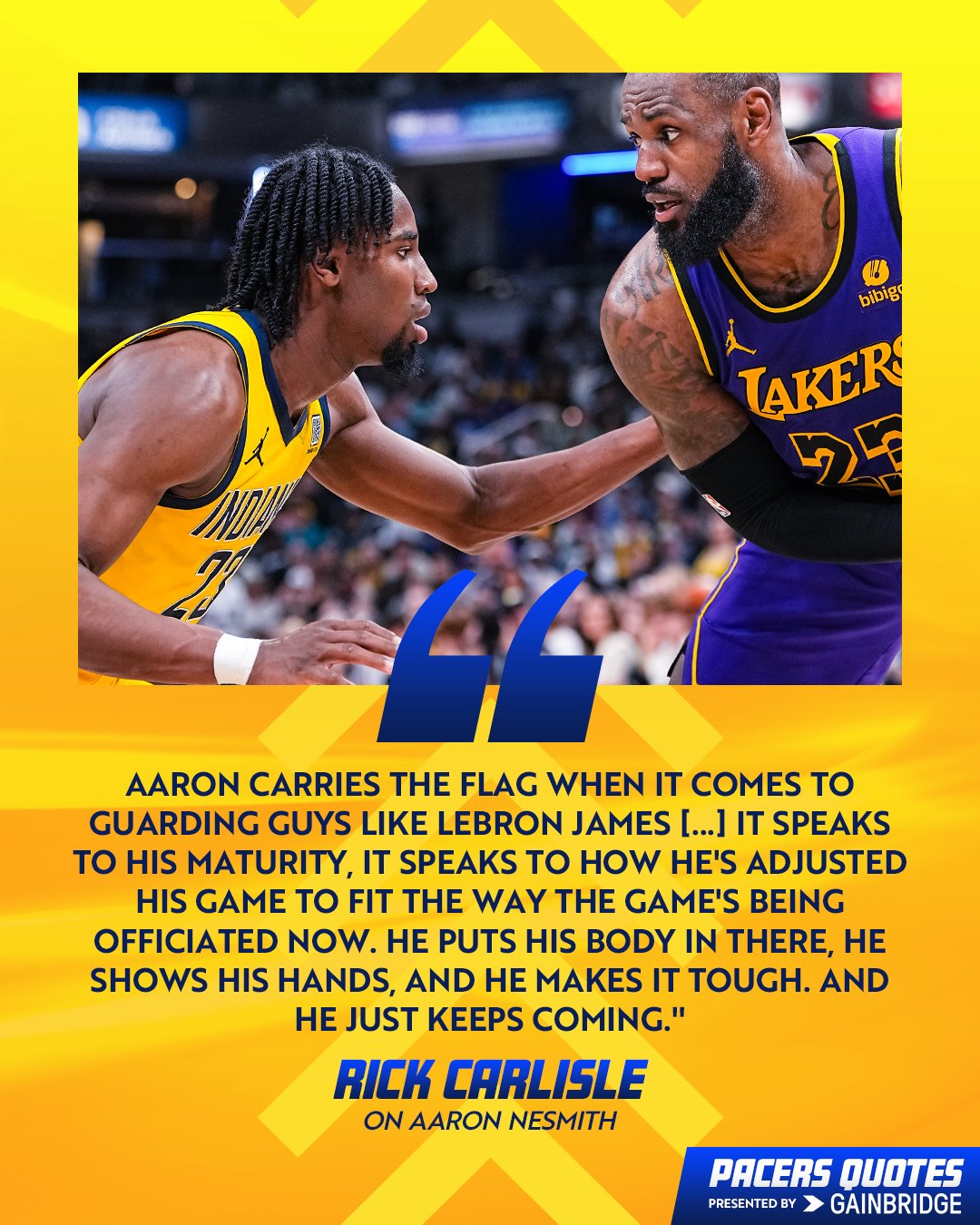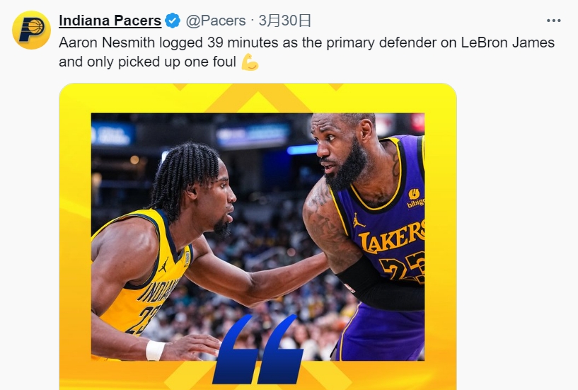 步行者官推的图片中也附上了主帅卡莱尔对内史密斯的称赞:“当要防守像詹姆斯这样的家伙时,内史密斯总是带头冲。这(只有1次犯规)展现了他的成熟,展现了他对吹罚的调整,他将自己的身体放在那里,展示自己的双手,让对手打得艰难,他永不停歇。”