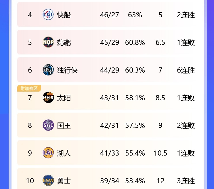 鹈鹕的战绩来到45胜29负,排在西区第五,落后第四的快船1.5个胜场,与第六的独行侠胜场差是0.5个。