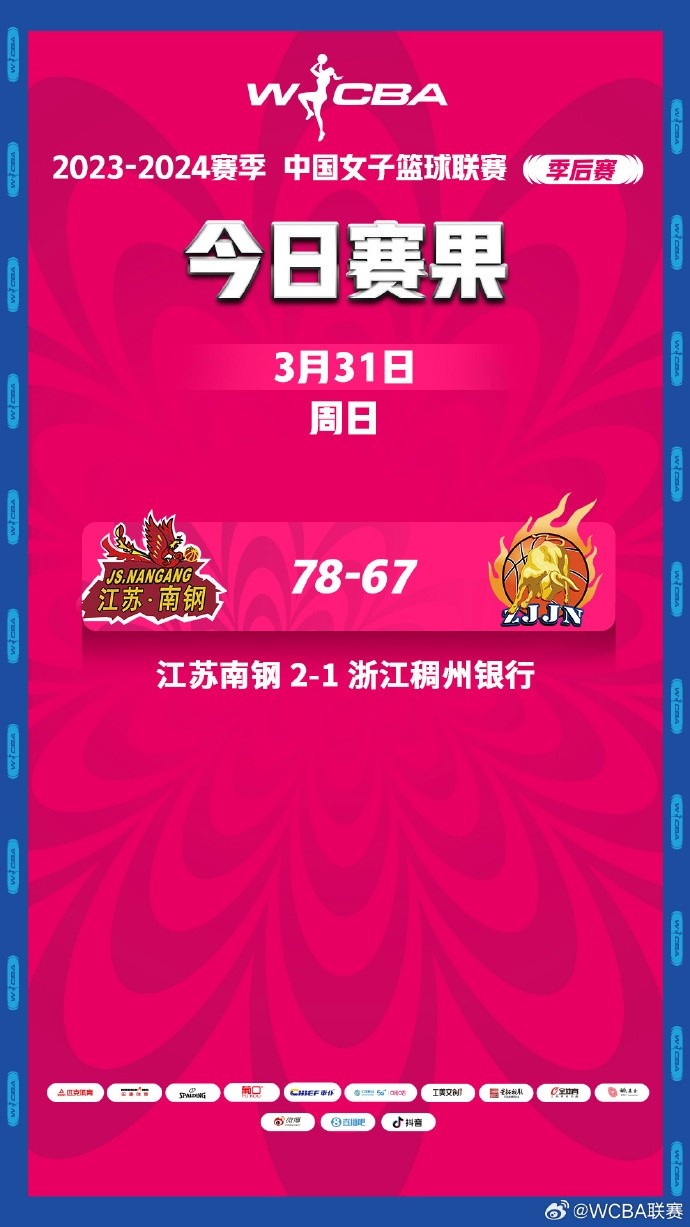江苏南钢78-67战胜浙江稠州银行。(大比分2:1)