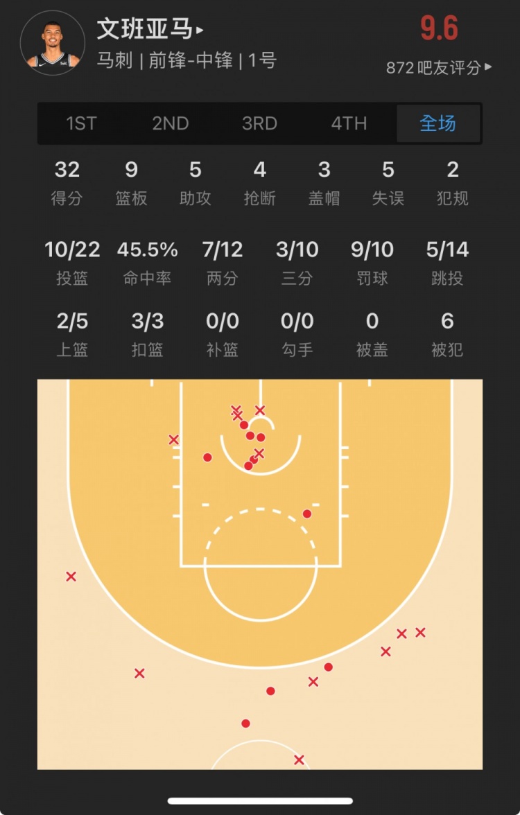 马刺状元秀 维克托-文班亚马 出战31.4分钟
