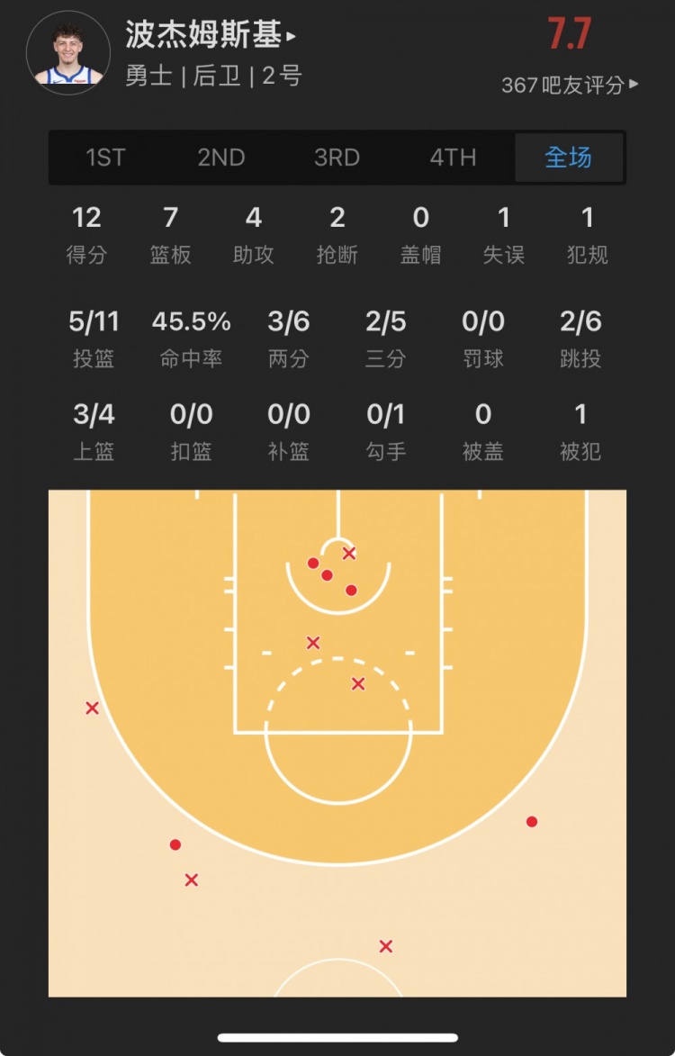 勇士19号秀 布兰丁-波杰姆斯基 出战23.6分钟