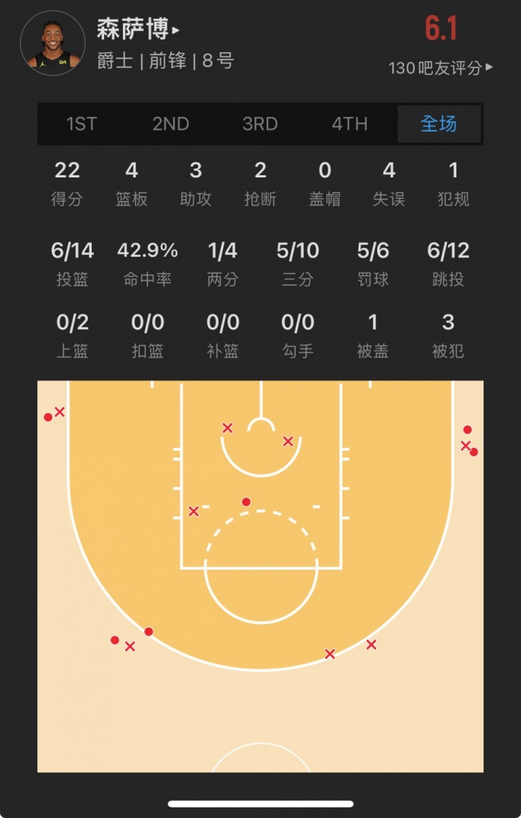 爵士28号秀 布莱斯-森萨博 出战33.7分钟