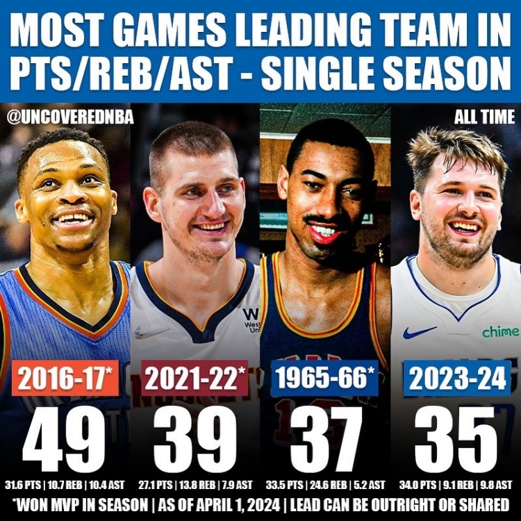16-17赛季威少、21-22赛季约基奇、65-66赛季张伯伦均拿下当赛季MVP