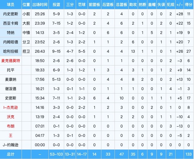 本场比赛,步行者全队多点开花,共有6人得分上双。分别是:哈利伯顿27分、杰伦-史密斯17分、西亚卡姆15分、托平14分、内史密斯11分、麦康纳10分。