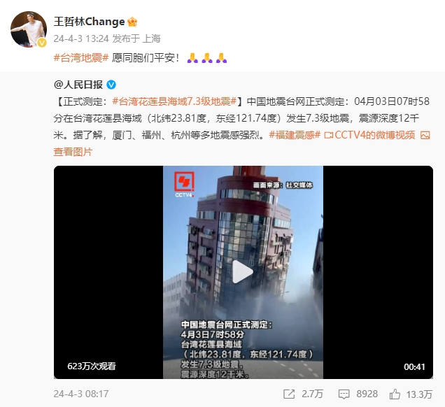 值得一提的是,CBA联赛中也有包括王哲林、时德帅等不少球星,发文为台湾同胞祈福。