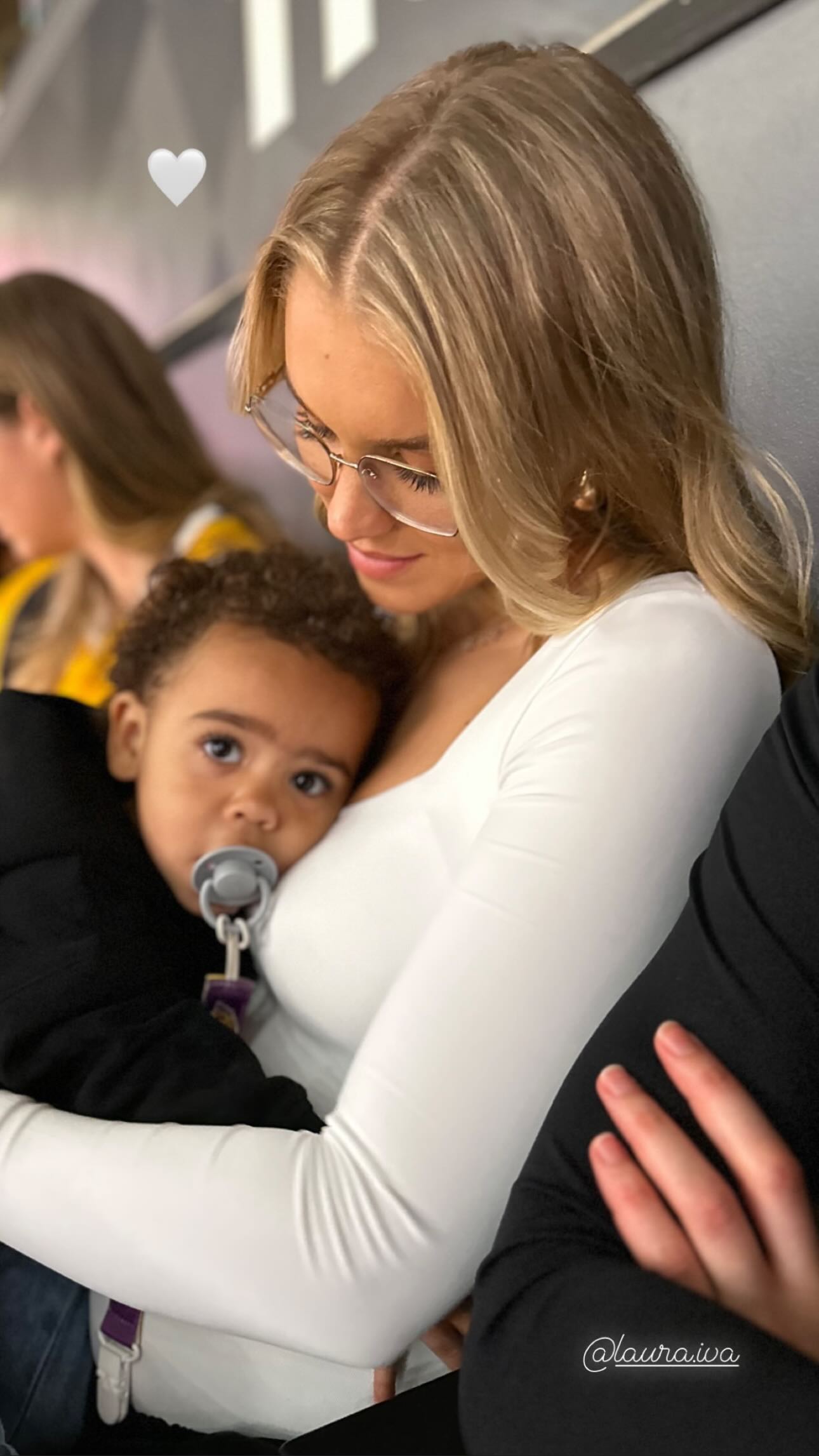 04月03日讯 今日湖人128-111击败猛龙,拉塞尔的女友、加拿大人劳拉带着儿子现场观战。