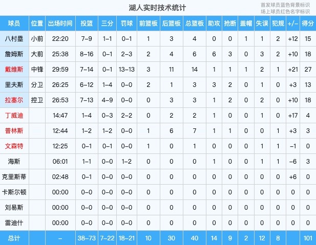 比赛前三节,湖人首发五虎均已得分上双。浓眉27分、詹姆斯18分、拉塞尔18分、八村塁15分、里夫斯13分。