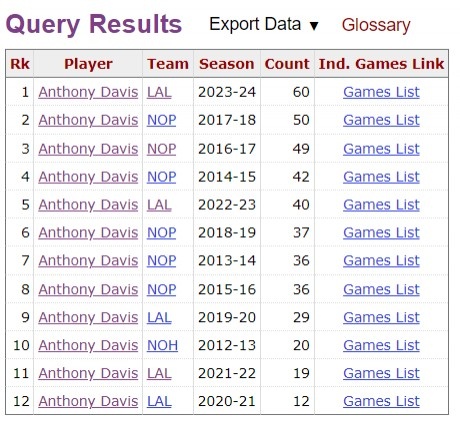 浓眉生涯各个赛季两双次数一览