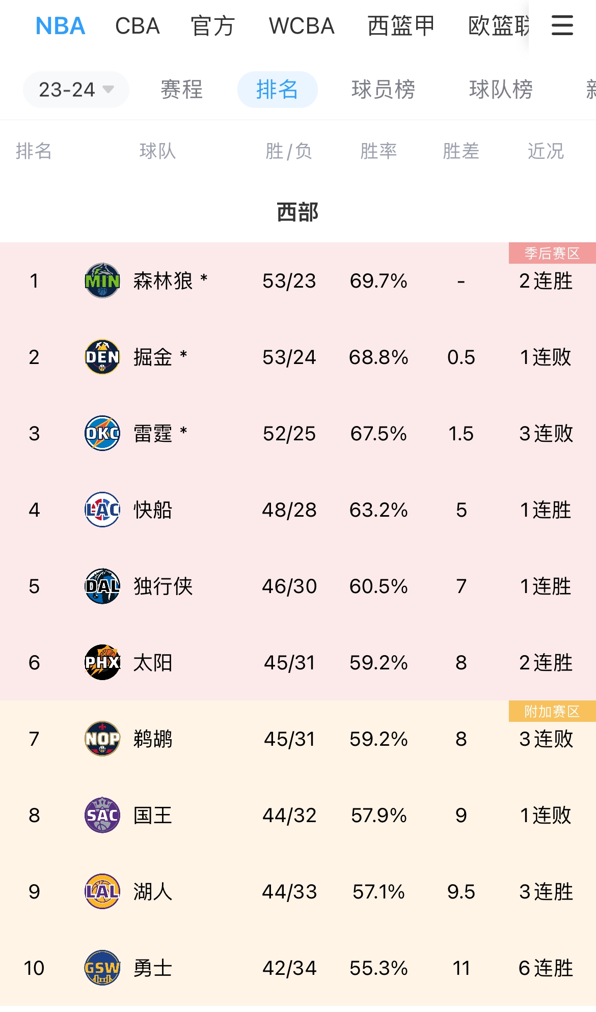这样,雷霆与西部第一森林狼胜场差来到1.5,与掘金的胜场差来到1。