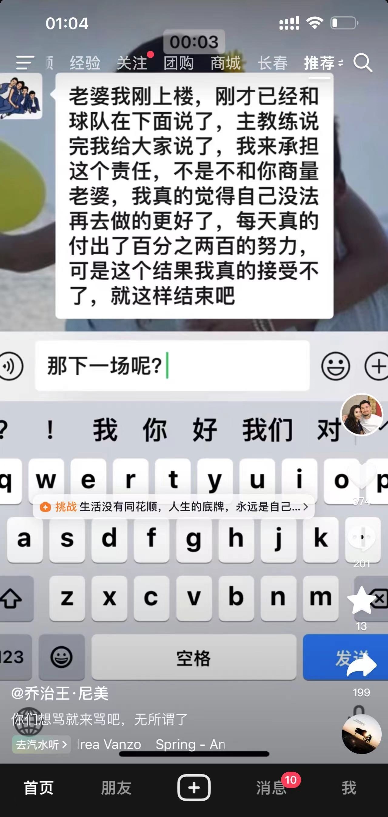 世预赛亚洲区36强赛第三轮,国足客场两球领先遭到新加坡2-2战平,继续位列小组第三位,赛后国足队长张琳芃接受采访时表示:“比赛结束后我想了很久,我觉得是时候该结束自己的国家队生涯了。”张琳芃妻子则在社媒晒出了两人的聊天记录,写道:你们想骂就来骂吧,无所谓了。