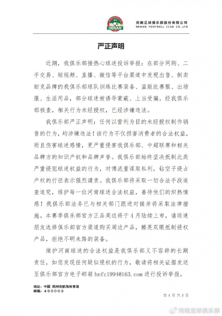 我俱乐部严正声明:任何以营利为目的未经授权制作销售的行为,均涉嫌违法!该行为不仅损害了消费者的合法权益,而且伤害球迷感情,更严重侵害我俱乐部、中超联赛和相关品牌方的知识产权和品牌声誉。我俱乐部始终坚决抵制此类严重侵犯球迷权益的行为,对博流量谋取私利,钻空子侵占产权的行径表示强烈谴责。我俱乐部将采取一切合法手段追查追究,维护每一位河南球迷合法权益,善待他们的炽热情感!我俱乐部法务已与相关部门跟进对接并将采取法律措施。本赛季俱乐部官方正品周边将于4月陆续上市,请球迷朋友选择俱乐部官方渠道购买周边产品,擦亮双眼抵制侵权产品,拒绝不明来路的装备。