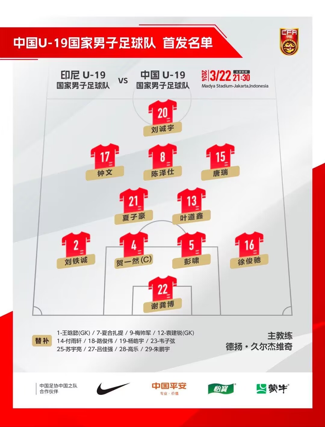 03月22日讯 今晚21:30,足球友谊赛,中国U19vs印度尼西亚U19。本场比赛的首发已经出炉。