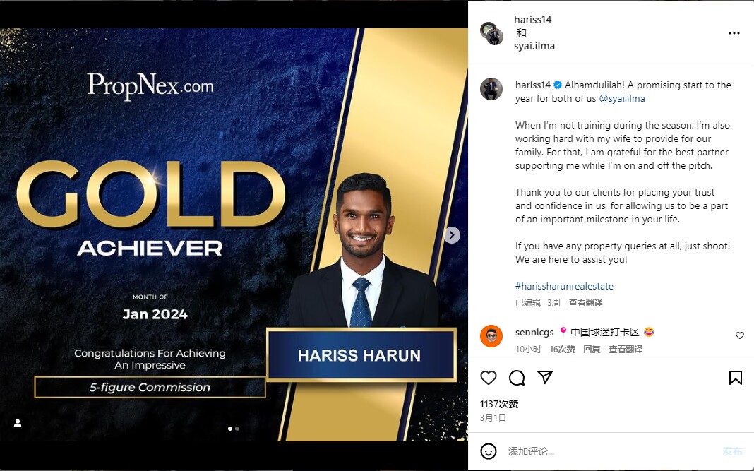 根据哈伦自己的社媒介绍,他于2023年9月25日和妻子一起成为了房产中介,并在今年1月成为了月度佣金达到5位数新元的Gold Achiever中介。