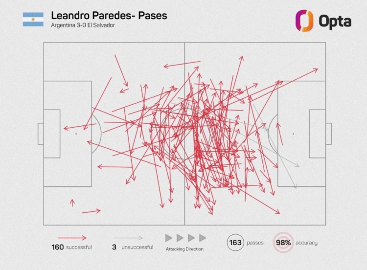 本场比赛帕雷德斯首发登场打满全场,他在本场共计163次传球中有160次成功,成功率高达98%。而160次成功传球也是自OPTA有统计以来,阿根廷国家队球员单场最高纪录。此前的纪录是德保罗在2022年对阵波兰时送出的137次准确传球。
