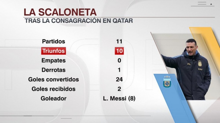 据ESPN统计,赢得2022年世界杯冠军之后,阿根廷参加11场比赛,战绩为10胜1负,打进24球仅丢2球,在这期间梅西打进8球队内最多,唯一的失利是在世预赛中主场0-2不敌乌拉圭。