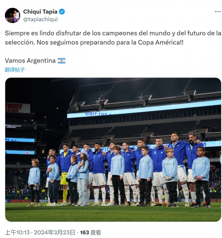 阿根廷足协主席塔皮亚在社交媒体上晒出球队首发阵容的合照,庆祝取胜,他写道:“欣赏世界冠军和国家队未来(指年轻球员)的比赛,总是很美好的事情,我们继续为美洲杯做准备。加油阿根廷!”