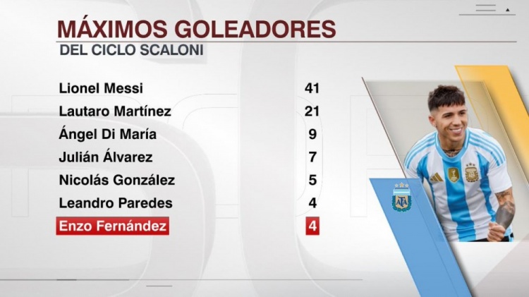 据ESPN统计,恩佐-费尔南德斯在阿根廷国家队打进4球,并列排名斯卡洛尼执教以来阿根廷队内射手榜第6位。