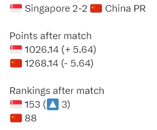 而在赛后,国足的FIFA积分将下降5.64分,总排名暂时没有变动;而新加坡则加了5.64分,此战后世界排名上升3位来到第153。