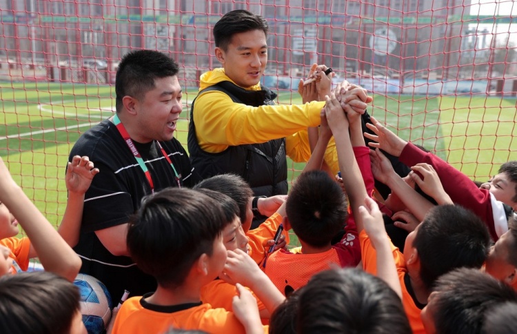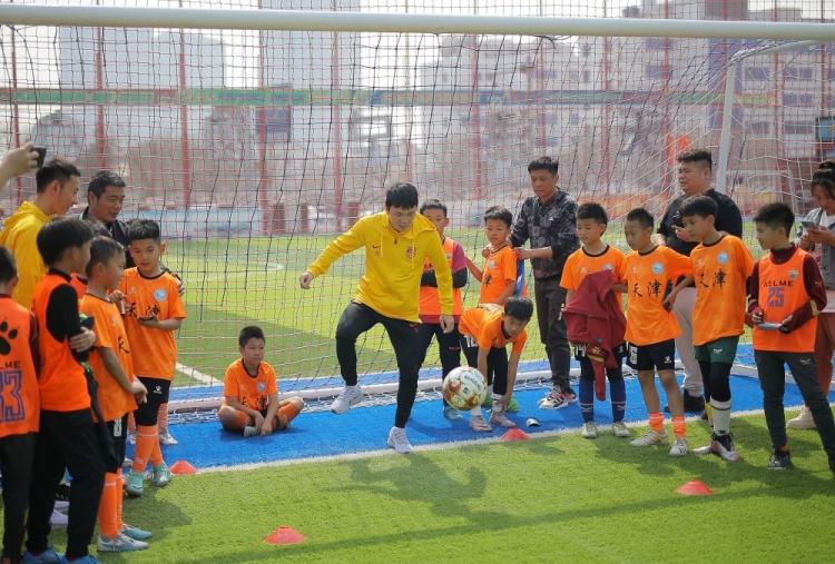与见面会遥相呼应,同样在23日中午,中国之队公益行在天津大吉利体育城足球场举办。活动现场,与助理教练陈涛,国脚蒋圣龙、王振澳和程进游戏互动的,是来自天津足协青训中心梯队的25名小球员。
